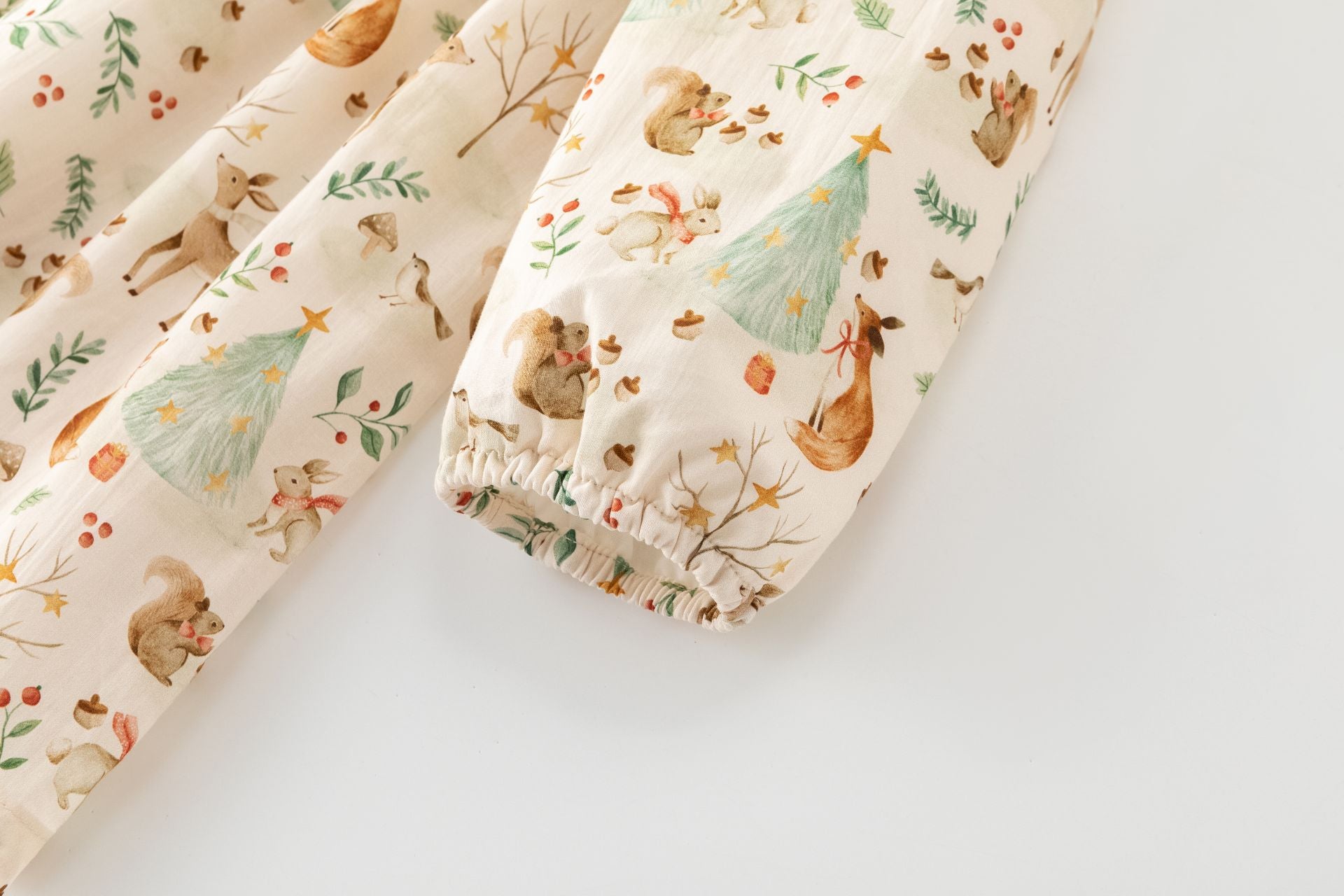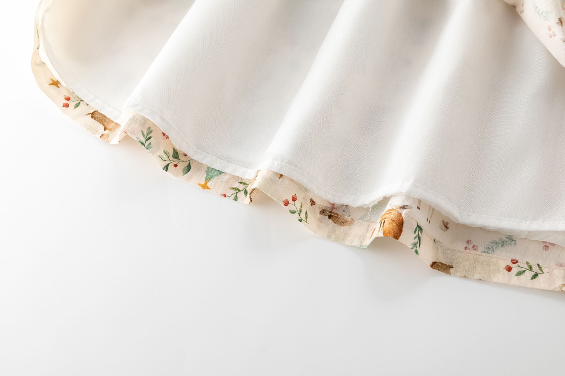 Vestido niña, con un espectacular estampado de animalitos de manga larga va forrado, con cuello y volante pequeño en el filo y goma en los puños y con cremallera trasera