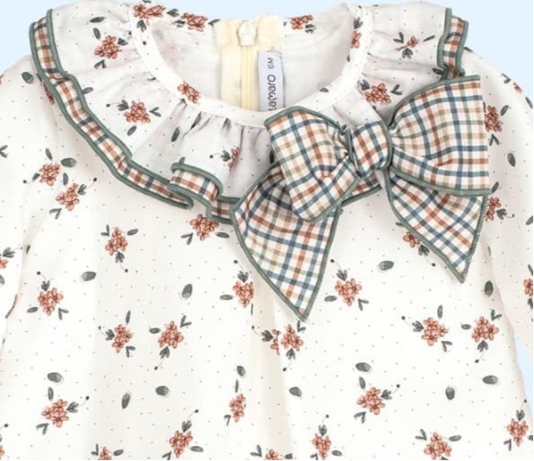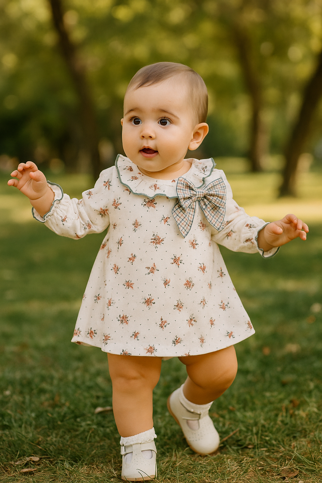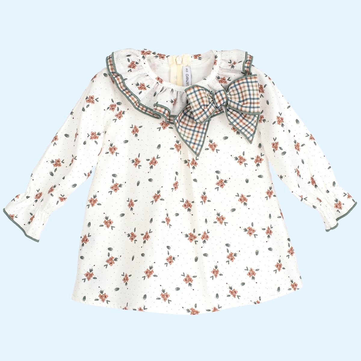 Vestido de niña evasé, con estampado floral, cuello redondo con doble volante y lazo decorativo de cuadros, manga larga con goma en el puño.